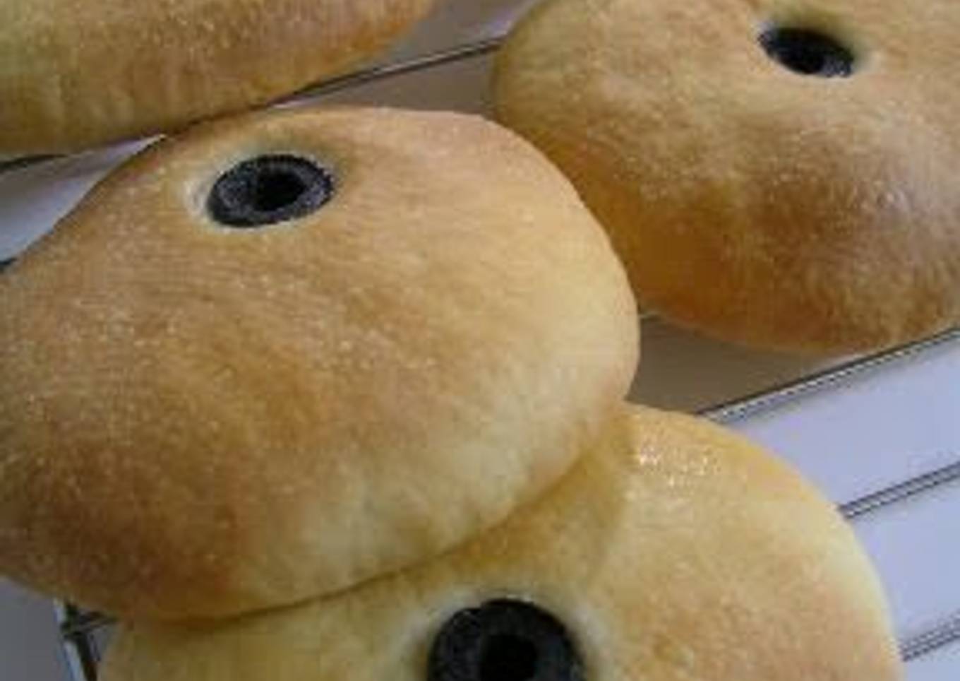 - Once the bread has risen, brush with olive oil (not listed), and press in the halved olives. Sprinkle with rock salt if you prefer.